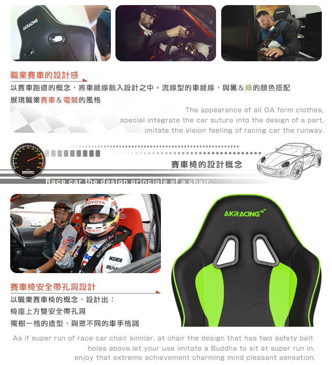 時尚強烈對比配色,外型邊緣設計恍若黑夜裡劃過一道綠色拋物線,落在墨色中渲染開來,線條瀟灑之餘更添空間魅力,精緻的手法完成這件充滿賽車張力且深具搶眼效果的超跑賽車椅造型。以充滿極限力學的設計手法展現超跑賽車椅的設計表情,變成一種概念性的突破,純粹中孕含豐富,簡潔又不簡單…以流暢的線條簡約地展現風馳電掣的瀟灑個性,濃濃的一股賽車椅流線型設計的藝術特色從AKRACING超跑賽車椅散發出來。外銷日/德/歐美..等20餘國,廣受專業人士的歡迎,椅背可隨心所欲360度旋轉,高背式設計,桶型賽車椅貼身包覆、人體工學背部支撐,背部弧度緩解脊椎壓力,享受極致舒適體驗, AKRACING超跑賽車椅俐落簡約的外型,正符合專業人士或電競玩家(上班族/學生/美術工作者/設計師/自由工作者/電競玩家…)需求,巧妙設計下,坐擁有了平衡而不迷失的時尚品味,頭枕鏤空設計既是裝飾也具透氣功能。座墊下方圓盤為氣壓調整器,隨意調整座椅高低,背靠阻力調節設計,可因應個人體重而調較至適當阻力,高級環保PU皮質,易與任何材質桌類搭配。