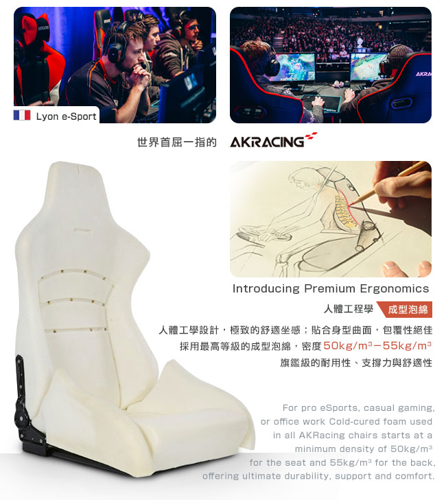 AKRACING從使用者的坐姿,座位高度,腿部壓力均衡,腰部支撐,頸椎支撐,手臂支撐等多個開點,研發出符合人體工學的辦公座椅,使人們在工作和生活享受前所未有的健康、舒適、便捷。